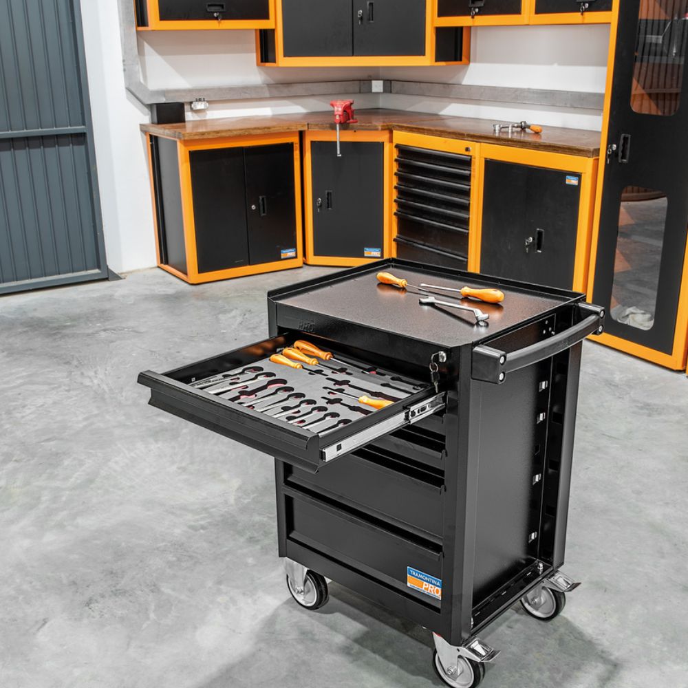 Carro de ferramentas Tramontina PRO com 5 gavetas, 1 porta e 204 peças, ideal para manutenção profissional que exige organização, alta capacidade e produtividade no dia a dia.
