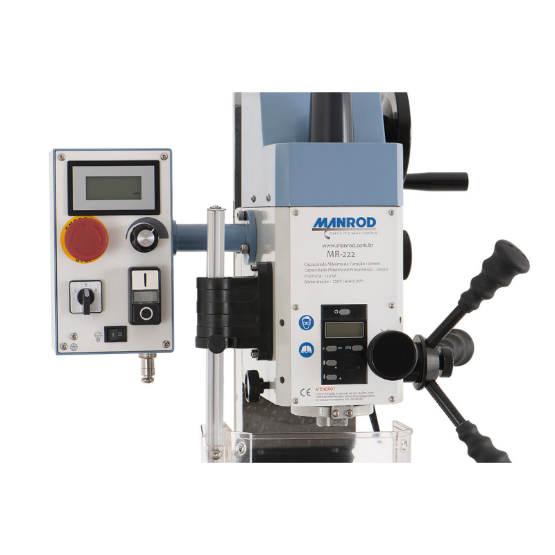 A Furadeira Fresadora MR-222 da MANROD possui capacidade de furação até 20 mm, cabeçote inclinável ±90°, indicadores digitais e mesa coordenada, oferecendo precisão e versatilidade para operações de usinagem.