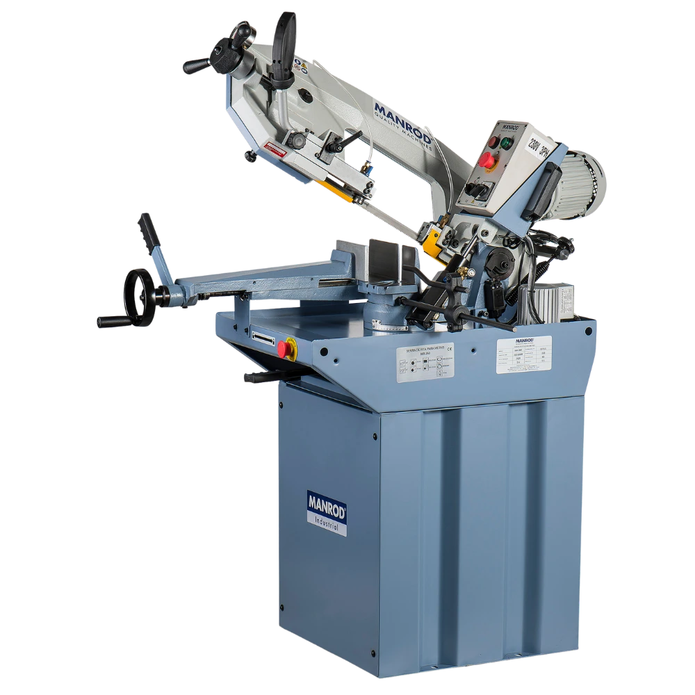 A Serra de Fita para Metais MR-260 da MANROD é uma máquina robusta para corte de tubos, barras e perfis metálicos. Possui motor de 1 HP, duas velocidades de corte (40 e 80 m/min), avanço hidráulico e sistema de refrigeração, oferecendo precisão e produtividade para serralherias e indústrias metalmecânicas.