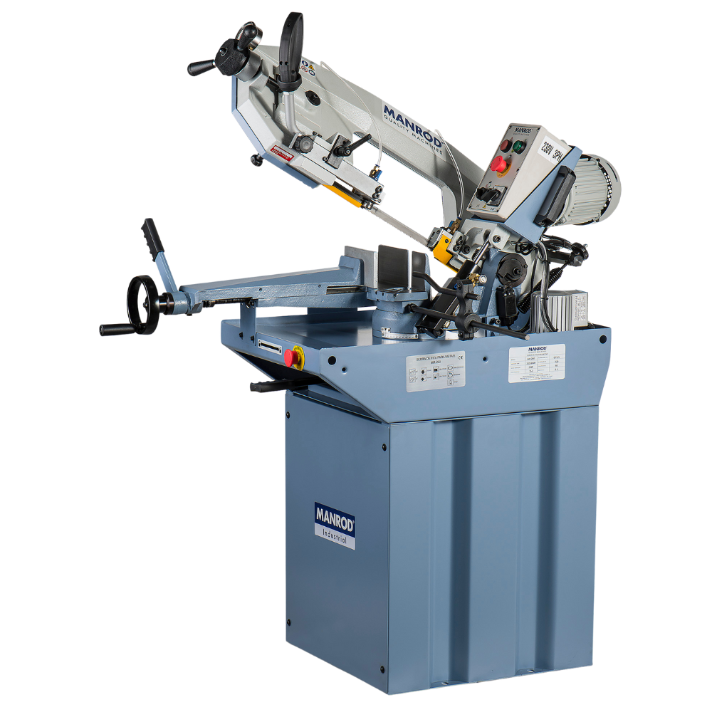 A Serra de Fita MR-275 VELOX da MANROD é um equipamento profissional para corte de metais com velocidade variável de 20 a 90 m/min e capacidade de até Ø225 mm. Possui avanço hidráulico, sistema de refrigeração e estrutura robusta, sendo ideal para serralherias, indústrias e oficinas metalmecânicas.